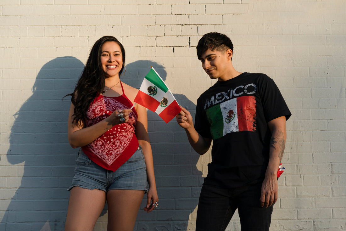 Idea de outfit: jeans rectos azules, playera blanca básica, chamarra ligera en tono verde y unos Kswiss blancos. Agrega un detalle rojo (pañuelo, bolso o accesorios) para un look sutil pero lleno de espíritu mexicano.